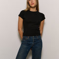 The RLT pointelle baby tee is crafted locally in LA with 100% cotton pointelle fabric. This tee is designed to have a slightly shrunken fit, though the material is very soft and offers a good amount of stretch. The pointelle tee is finished with a box-stitch hem.