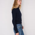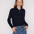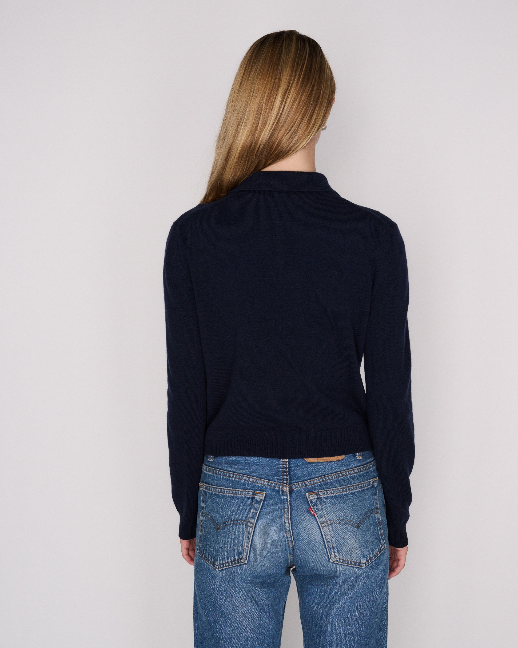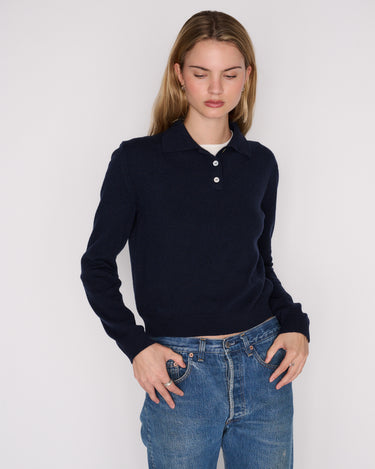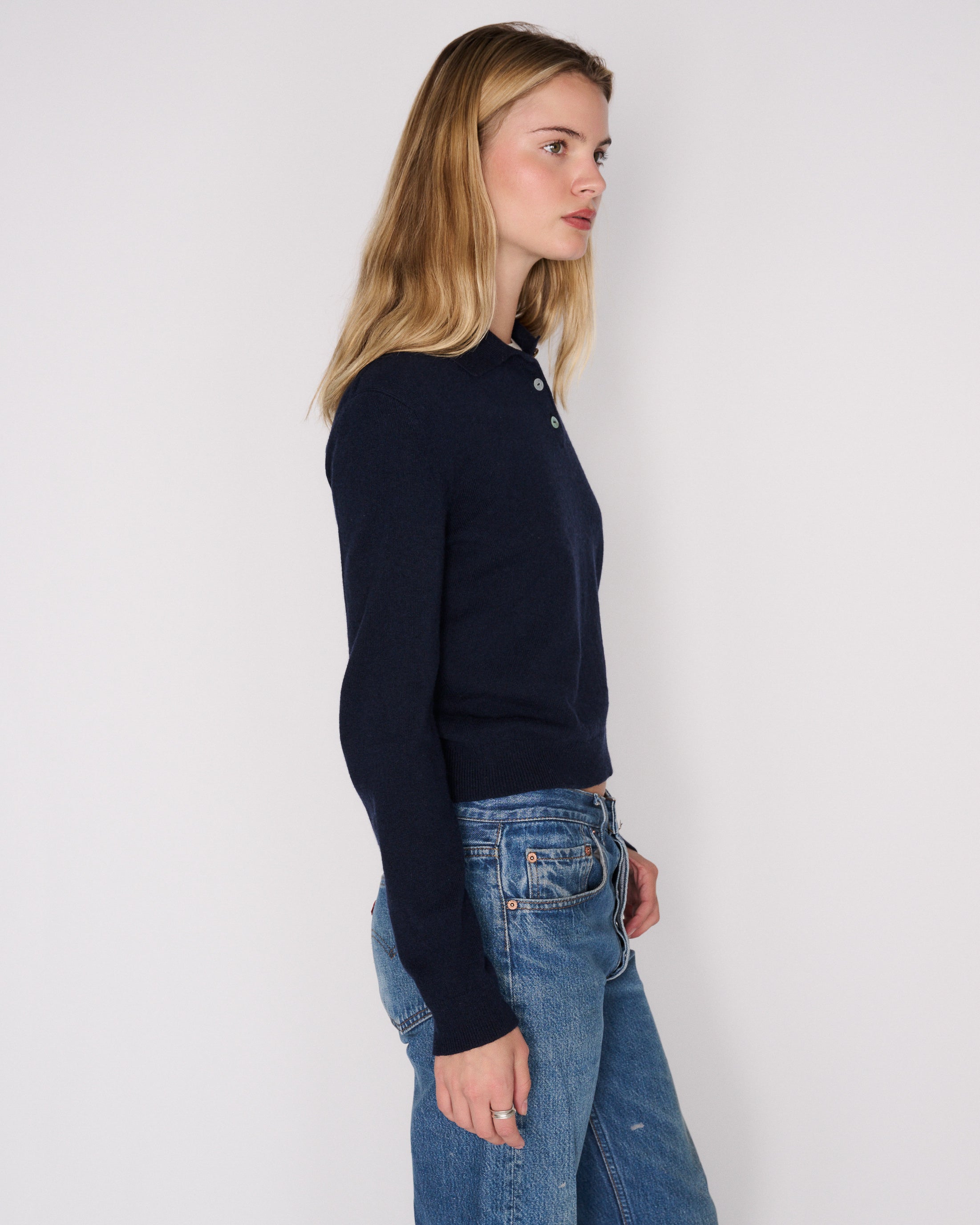 The RLT polo sweater is made from our signature cashmere wool blend and finished with mother of pearl buttons. Intended to have a mildly cropped and boxy fit, this sweater can be worn alone or layered. We recommend sizing up for a looser look. For more assistance, kindly email us at info@shoprlt.com.