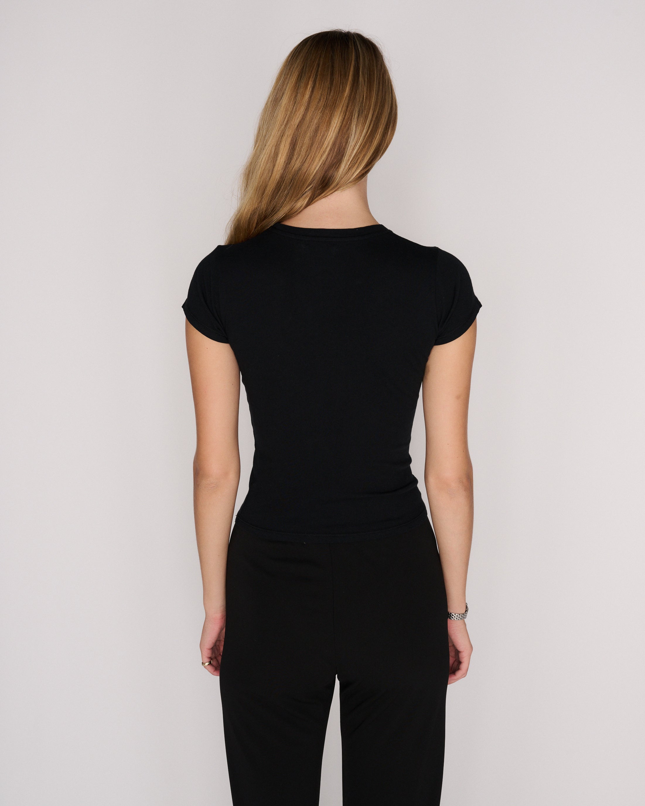 Layla Grace 5'11" size 4, wears a size small. Baby tees are made to fit snug -- if you would like a more traditional t-shirt fit or are between sizes, we recommend sizing up. For more assistance with fit, kindly email us at info@shoprlt.com.
