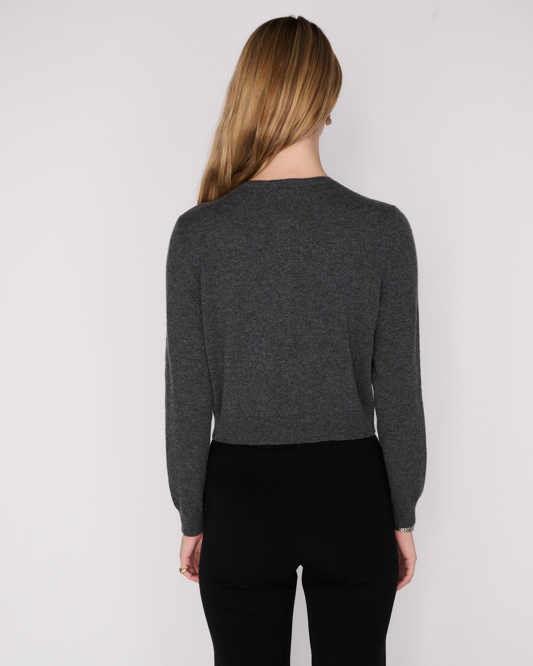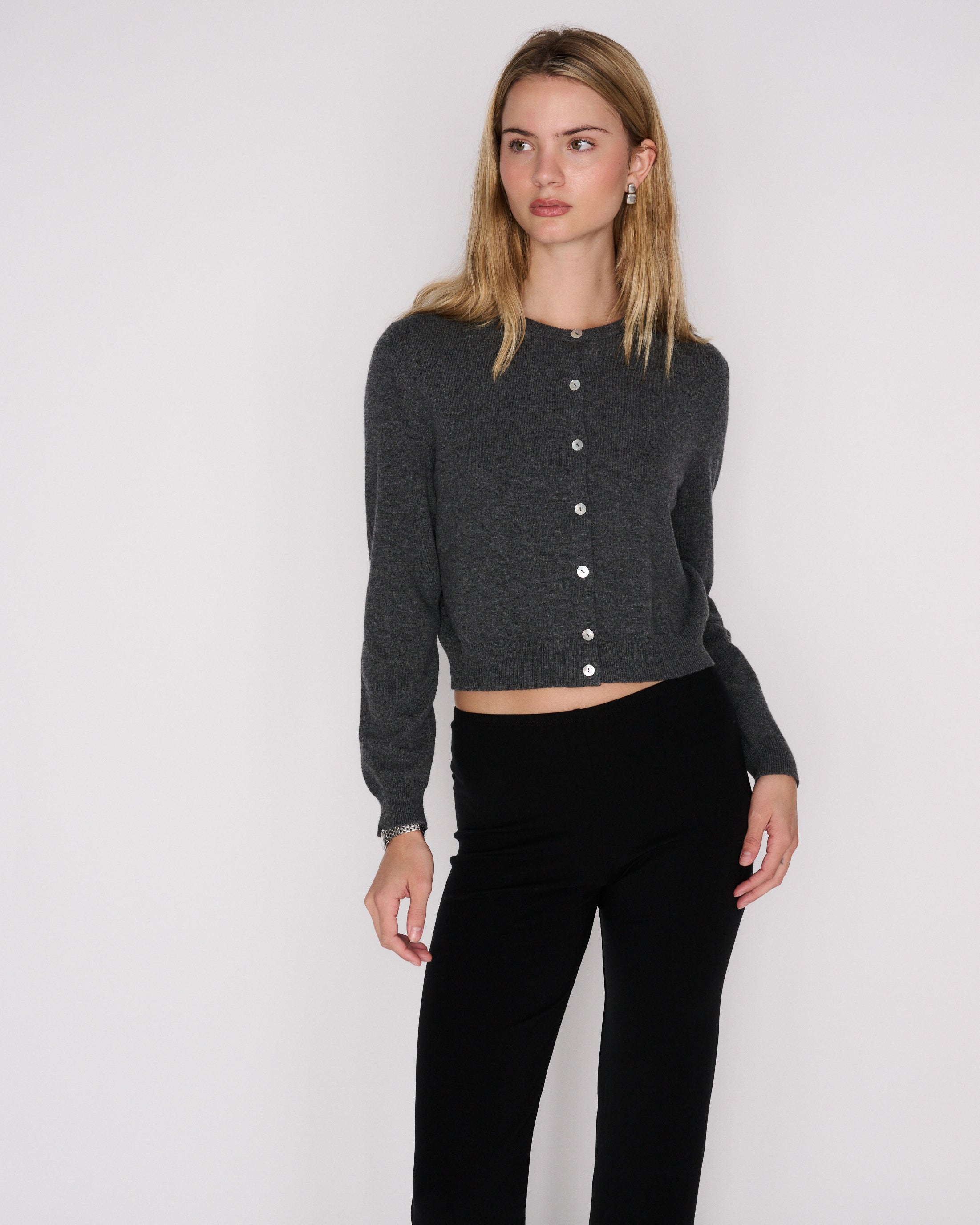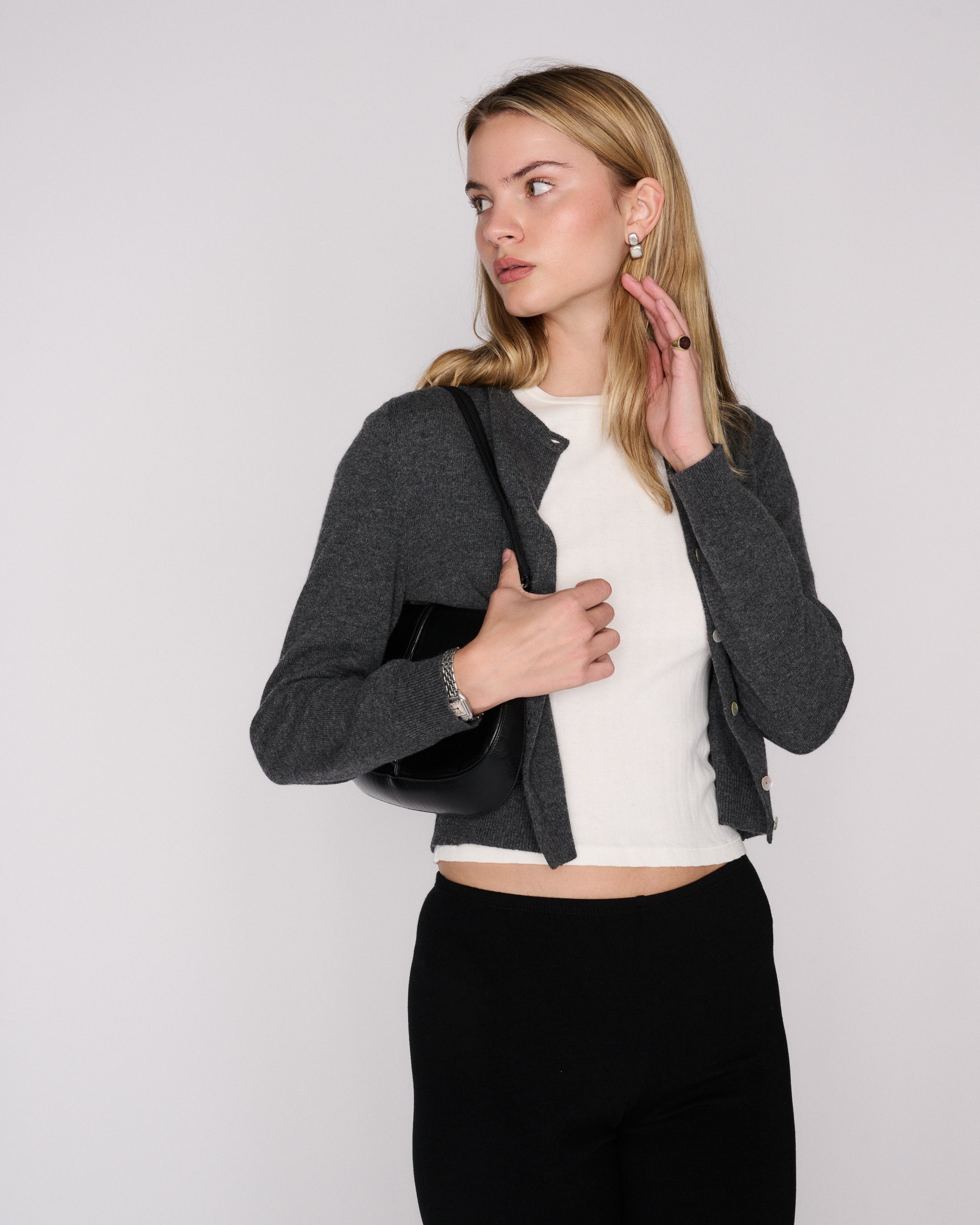 The Rachel sweater is a cashmere wool blend cardigan with mother of pearl buttons. Intended to have a mildly cropped and boxy fit. Wear it alone buttoned up or open. We recommend sizing up for a looser fit. For more assistance, kindly email us at info@shoprlt.com.