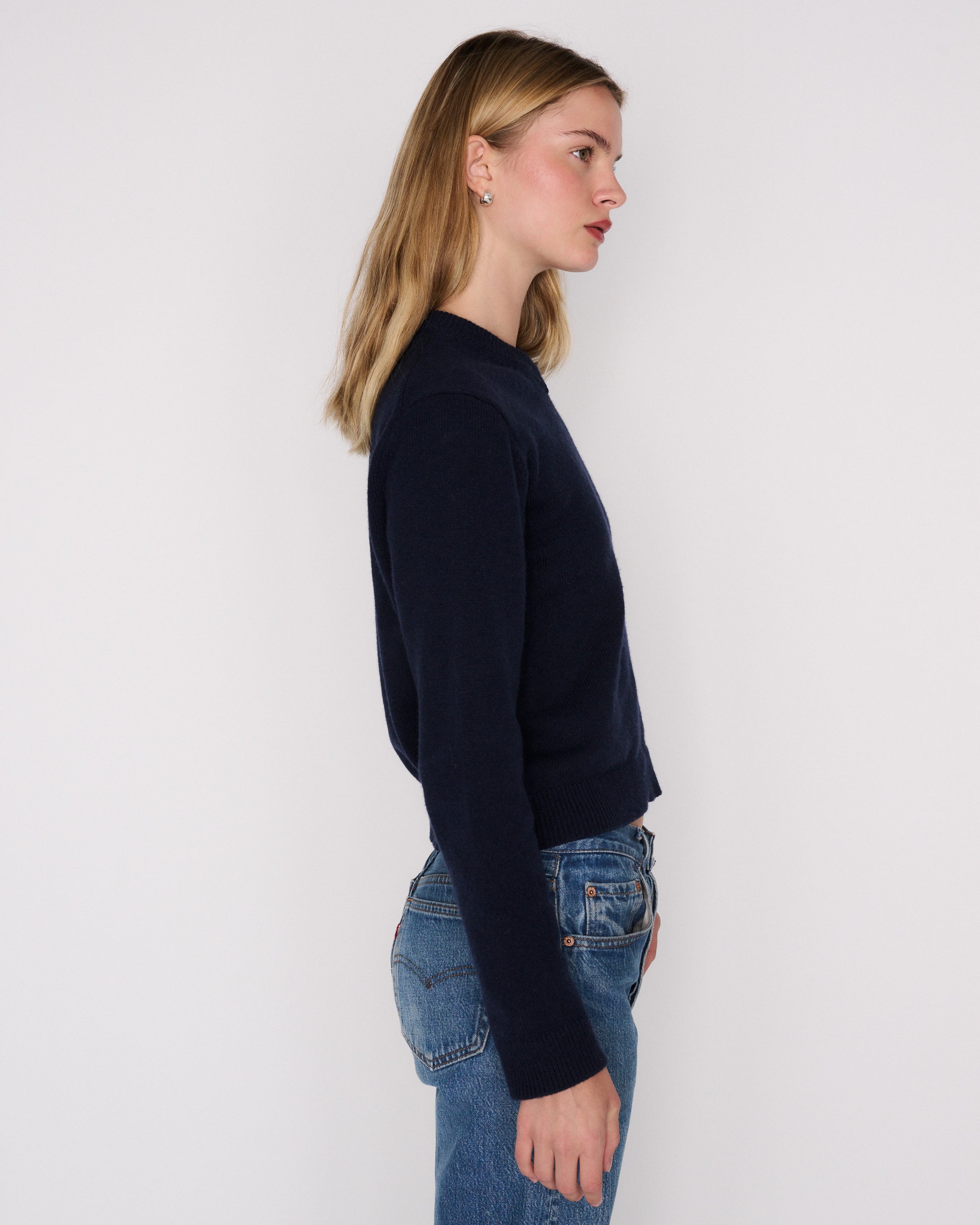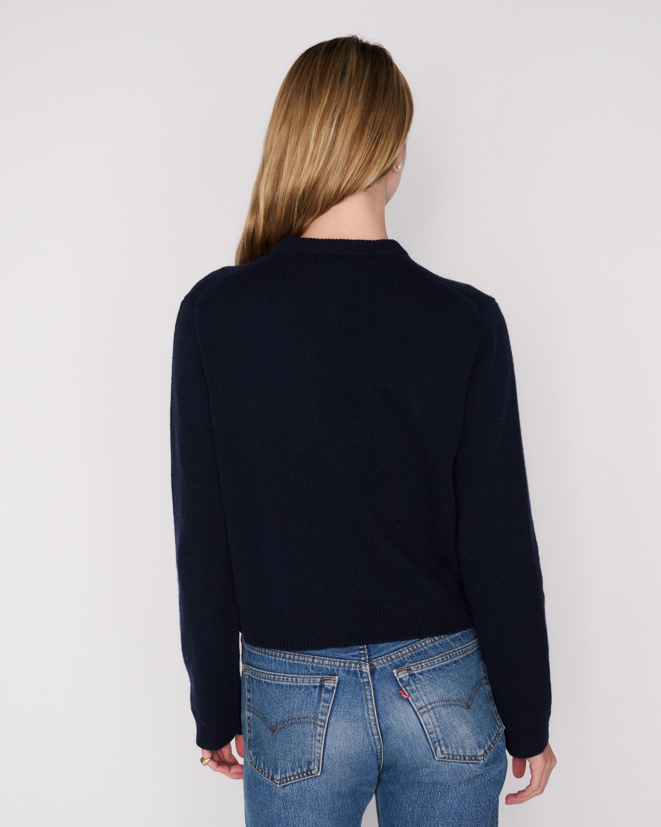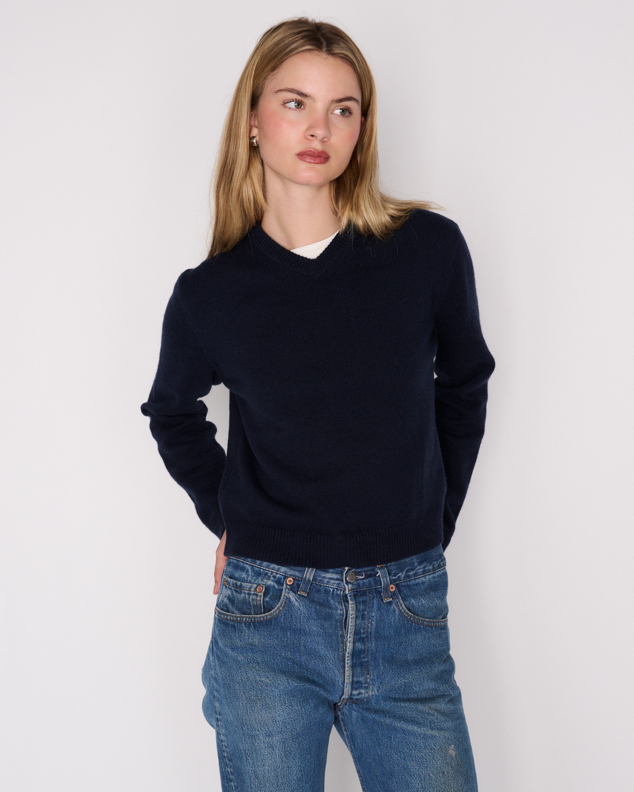 The RLT V-neck sweater is made from our signature cashmere wool blend, crafted locally in Los Angeles. With a 90's-inspired high v-neck and thick weave, this sweater can be worn alone or layered. We recommend sizing up for a looser look. For more assistance, kindly email us at info@shoprlt.com.