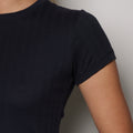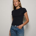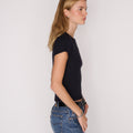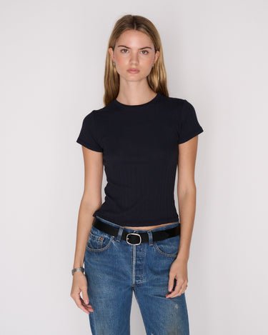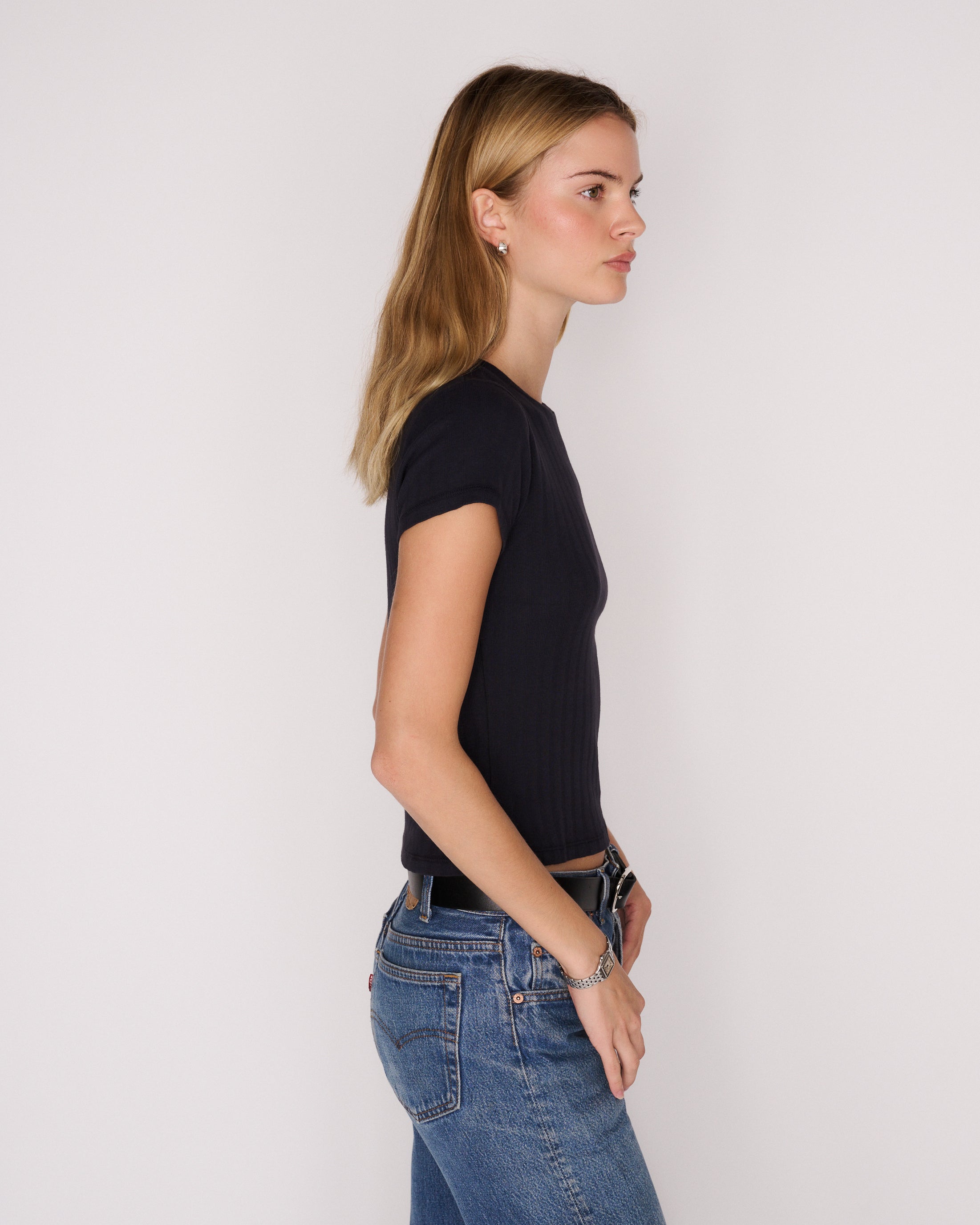 The RLT wide baby ribbed tee is crafted locally in LA using 100% cotton, this is designed to have a fitted look. Just like your favorite vintage tee, it’s finished with a box stitch sleeve and hem.