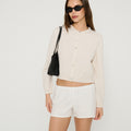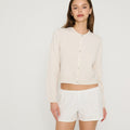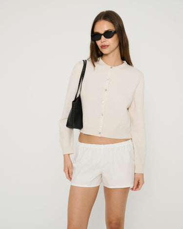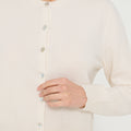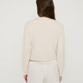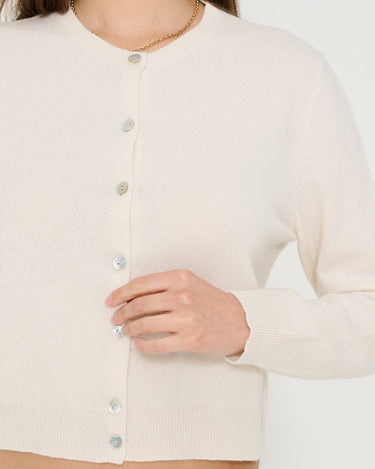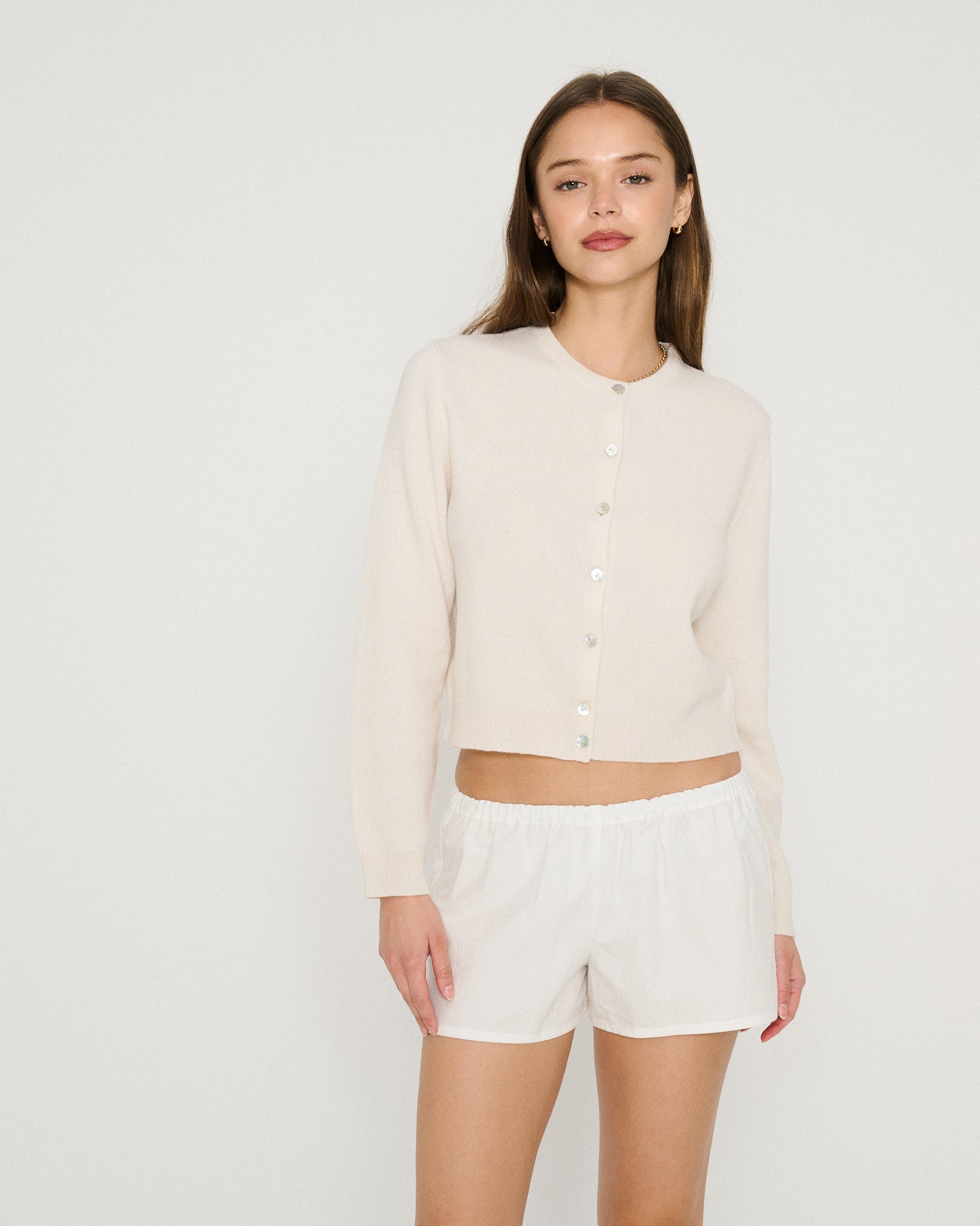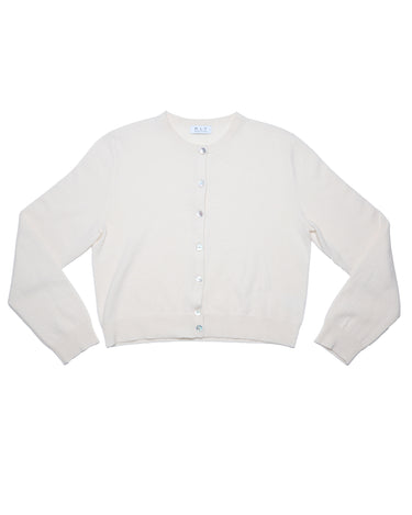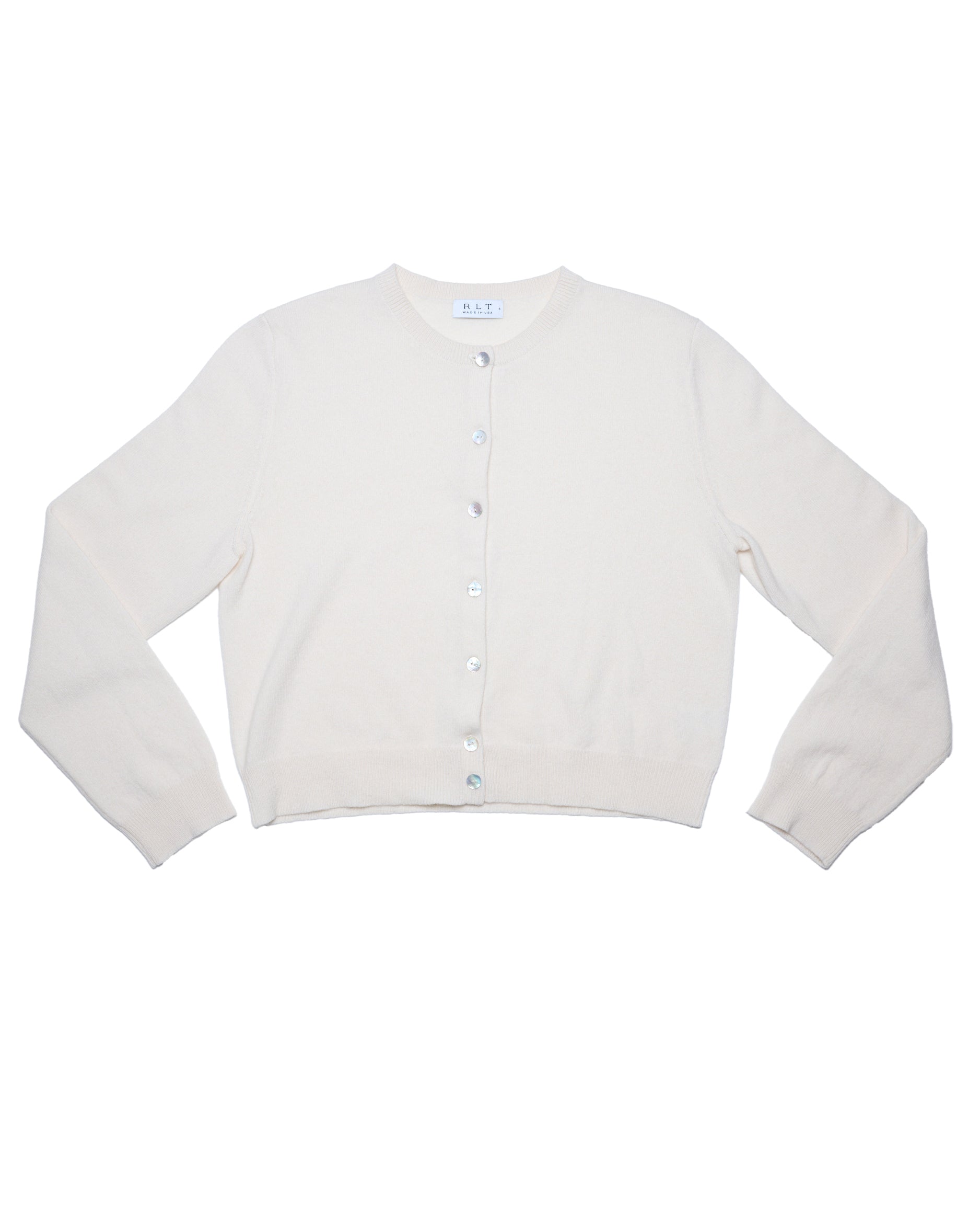 The Rachel sweater is a cashmere wool blend cardigan with mother of pearl buttons. Intended to have a mildly cropped and boxy fit. Wear it alone buttoned up or open. We recommend sizing up for a looser fit. For more assistance, kindly email us at info@shoprlt.com.