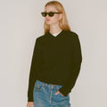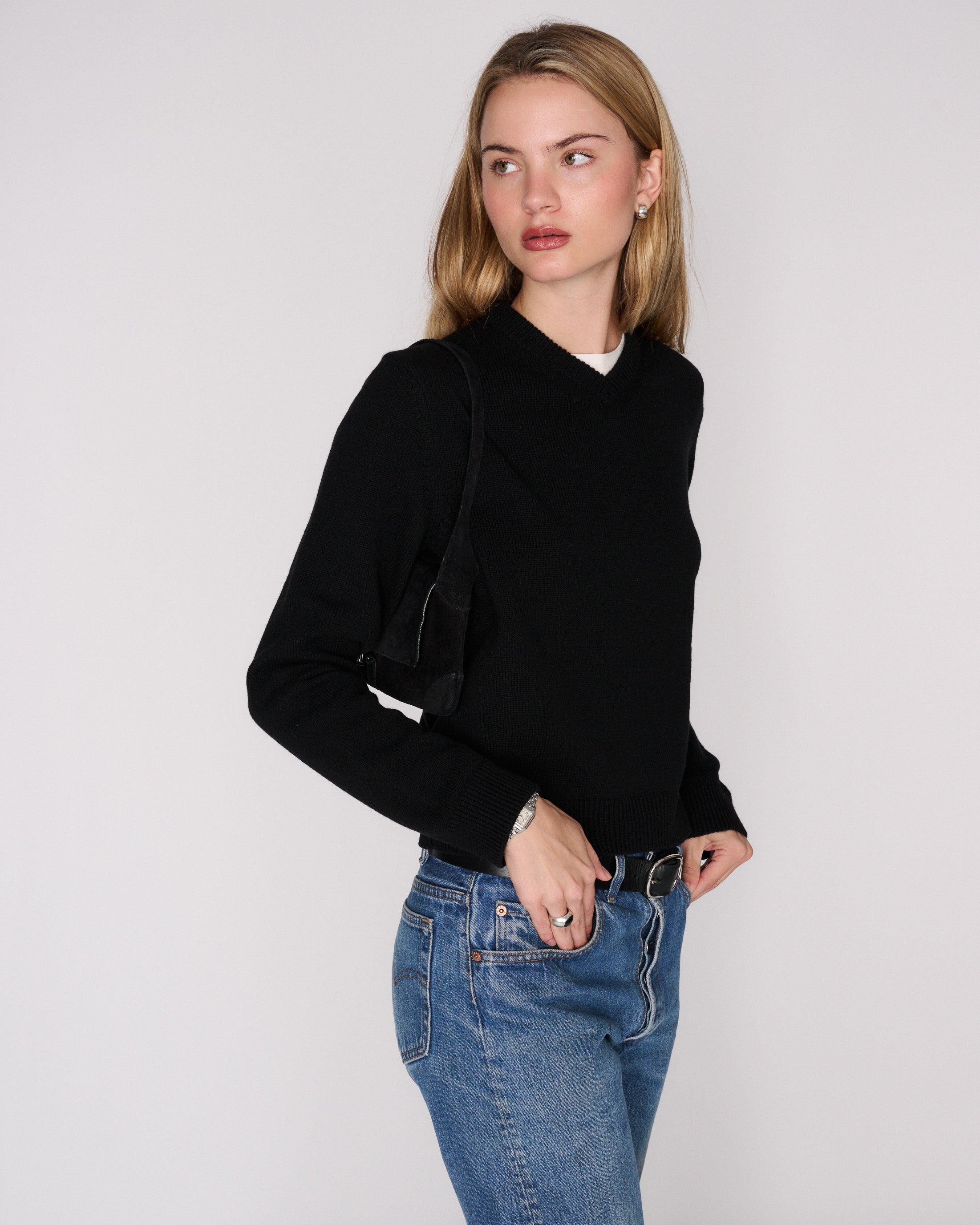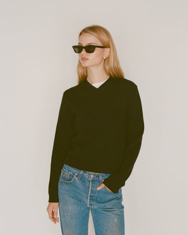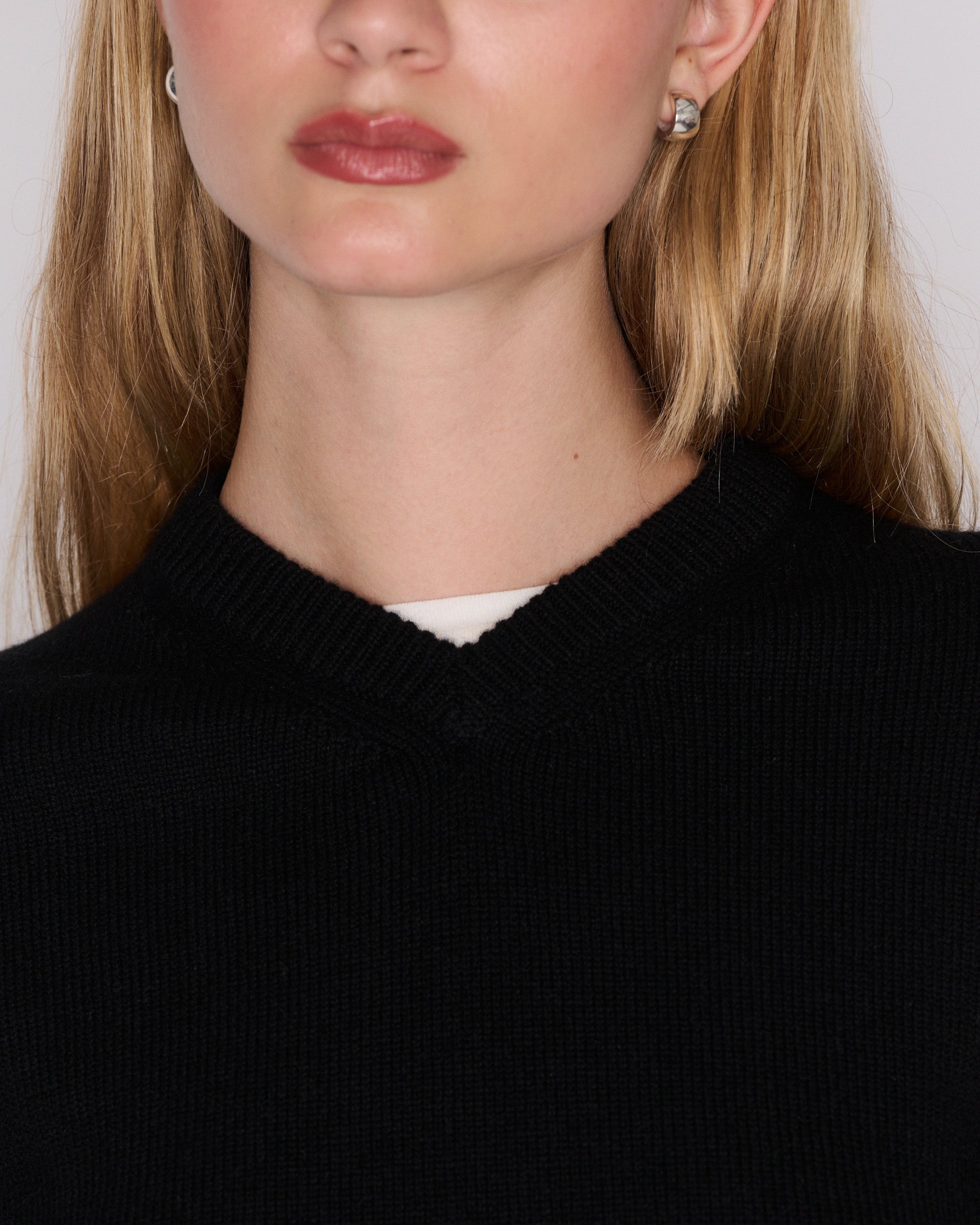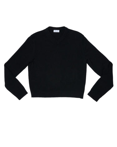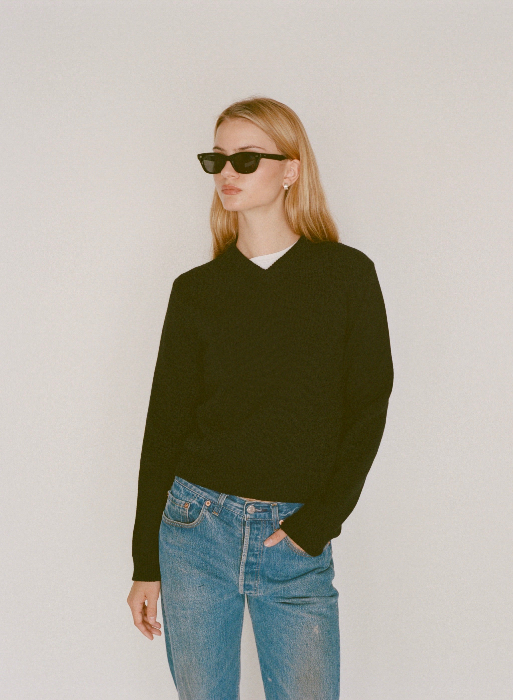 The RLT V-neck sweater is made from our signature cashmere wool blend, crafted locally in Los Angeles. With a 90's-inspired high v neck and thick weave, this sweater can be worn alone or layered. We recommend sizing up for a looser look. For more assistance, kindly email us at info@shoprlt.com.