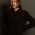 Rachel 5'8" taille 2 porte une taille petite. Les manches sont portées remontées sur la photographie sur fond gris.