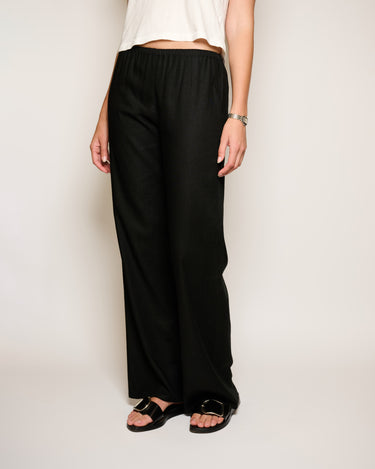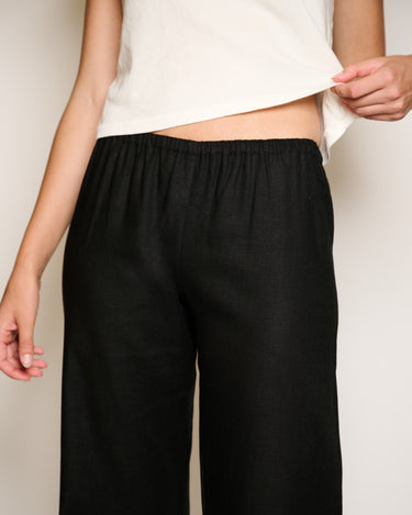 Crafted from black Japanese linen and fabricated locally in LA, this effortless summer pant has a mid-rise elastic waist with a straight-leg relaxed fit. Designed to be paired with just about anything, it's the perfect pant for home or vacation.