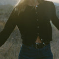 Rachel 5'8” 사이즈 2는 S 사이즈를 착용했습니다. 회색 배경 사진 속 소매는 위로 밀어 올려 착용한 모습이다.